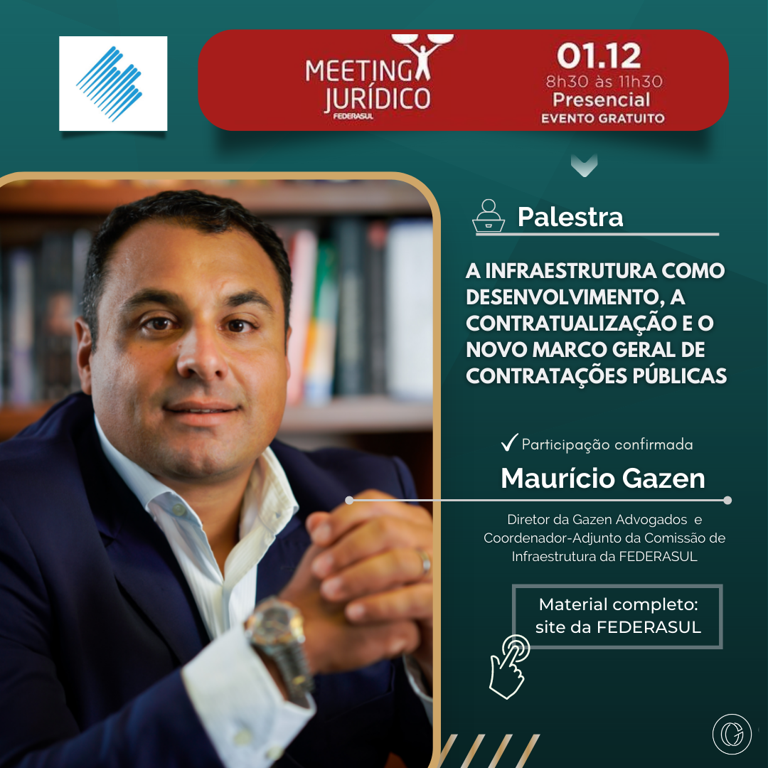 O diretor da Gazen Advogados, Maurício Gazen, é um dos palestrantes conformados da próxima edição do Meeting Jurídico da Federasul, que acontece no dia 01 de dezembro, em Garibaldi (RS). O evento é promovido pela Comissão Permanente de Infraestrutura da Divisão Jurídica da Federasul, e abordará o tema: “A infraestrutura como desenvolvimento, a contratualização e o Novo Marco Geral de Contratações Públicas”.